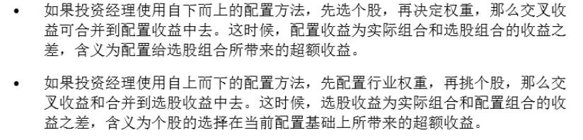 一种解决办法是,根据配置思路,将交叉收益合并到选股收益或者配置收益中去:
