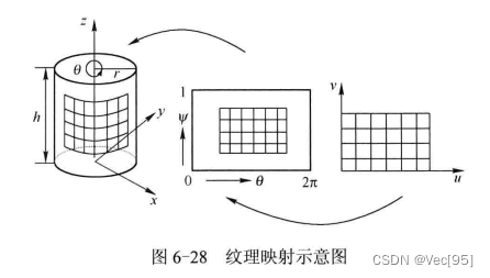 其中纹理空间可以定义为u-v 空间,每个轴标范围为 (0.1)。其中对于一个纹理图像,其左下角 v 标为 0.0),右上角标为 1.1)。而对于简单的参数模型,可以方便地建立模型与纹理空间的映射关系,例如球面、圆柱面等。