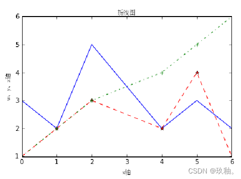 在同一绘图对象中可用plot()方法同时绘制多个图形,例如: plt.plot(x, w, 'b',x, y, '--*r', x, z, '-.+g') 表示在同一绘图对象中同时呈现x-w、x-y和x-z三组变量的图形,并且分别以蓝色实线无描点、红色虚线星描点、绿色点画线加号描点表示。