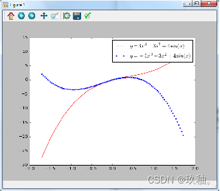二维函数图形的绘制可调用numpy.linspace()方法,先生成数据系列,再用plot()方法绘图。通式为: numpy.linspace(start, stop, num=50, endpoint=True, retstep=False) 其中,参数依次为自变量起点、终点、生成数据点数、是否包括终点、是否返回间隔。 在同一绘图对象中,分别以红色实线和蓝色点状线绘出x在-1.7~1.7之间变化时的函数图形(100个采样点),并标注其图例和对应公式: y=3x3−3x2+4sin(x) y=−3x3−3x2+4sin(x)。