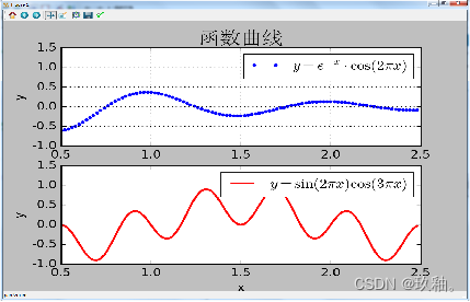 并且在上、下两个子图中分别用蓝色点状线和红色实线呈现x在0.5~2.5范围内变化的函数图形,分别标注坐标轴标签、图例和相应的公式。