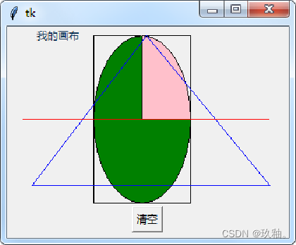 在320×240的窗体上创建高200像素,宽300像素的画布,鼠标单击画布,依次绘出:从(90,10)到(200,200)点的矩形;从(90,10)到(200,200)点的内切椭圆并填充绿色;从(90,10)到(200,200)点的内切扇形并填充粉红色;连接(20,180)、(150,10)和(290,180)三点形成蓝色框线且无色填充的三角形;从(10,105)到(290,105)点的红色直线;以(50,10)为起点用RGB"#123456"颜色绘制文本标签“我的画布”。单击“清空”按钮删除所有图形。