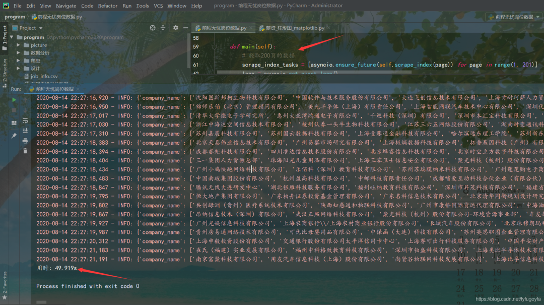 爬取了200页的招聘数据,共10000条招聘信息,用时49.919s。
