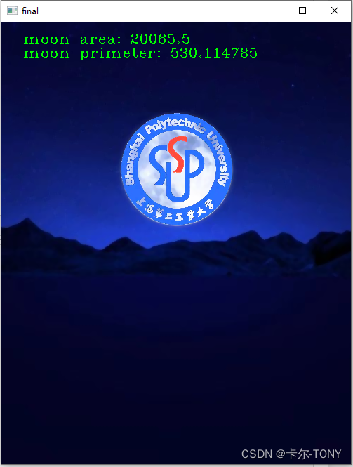 cv2.putText(imgcat,'moon area: 20065.5',(30,30), cv2.FONT_HERSHEY_COMPLEX_SMALL,1,[0,255,0])