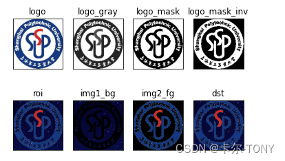 titles = ['logo','logo_gray','logo_mask','logo_mask_inv','roi','img1_bg','img2_fg','dst']