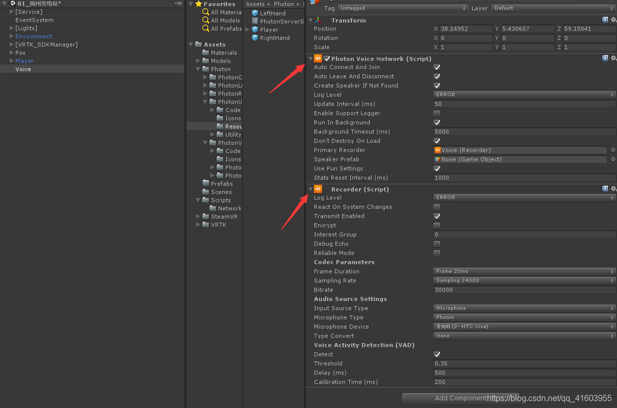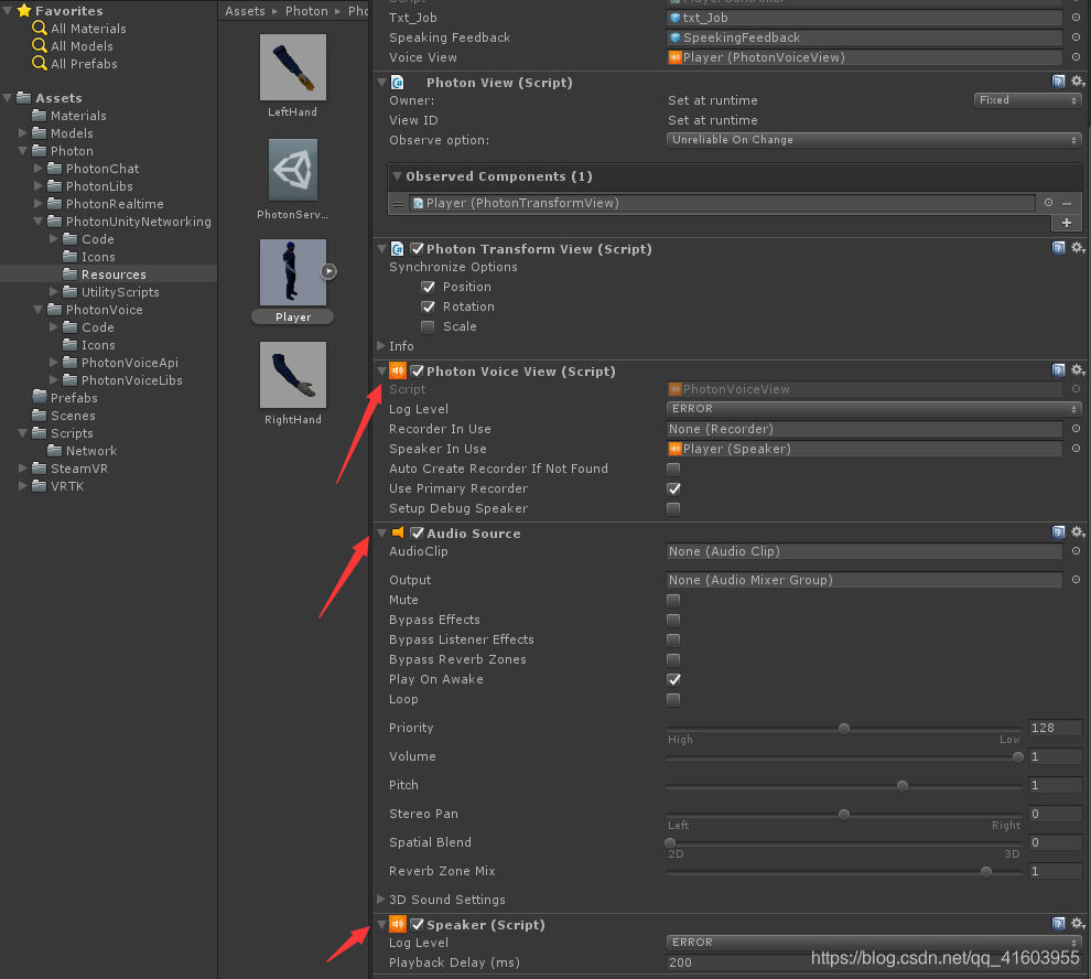 不废话,直接上步骤!第一步:给预制体Player添加三个组件,参数设置如图所示:第二步:创建空物体Voice,给空物体添加两个组件,参数设置如图所示:第三步:将Player拖出来,给它身上添加一个空物体SpeekingFeedback,设置为隐藏状态,其次,打开Player身上挂载的脚本PlayerController.cs,添加代码如下:using Photon.Voice;using Phot