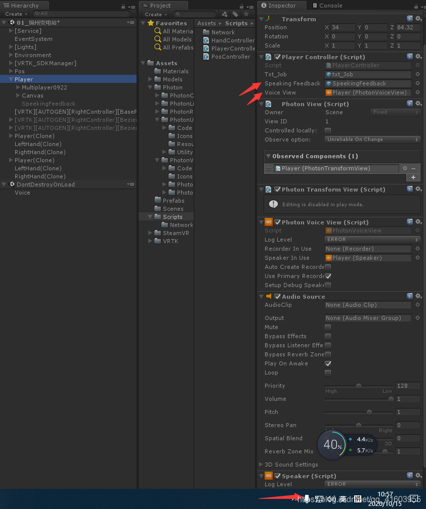 把空物体SpeekingFeedback和Player拖挂上去,Apply一下Player预制体,删除当前列表上的Player就好了,最后再打包运行两个程序,会发现电脑的右下角弹出语音播放按钮(不一定所有电脑都是这样),就可以进行网络语音通话了: