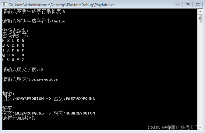 主要函数1、Creat_Key(char* s,int L, char Matrix[5][5])生成密钥Matrix矩阵2、Encrypt(char Matrix[5][5],int L, char* s, char *s0, bool reverse)根据密钥矩阵加密或解密加密:s为明文,s0为密文字符串存储位置,reverse=0解密:s为密文,s0为明文字符串存储位置,reverse=1注