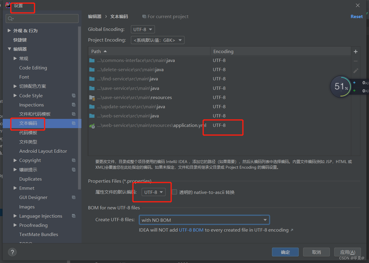 方法一:application.yml的编码变成了gdb,我们要将其编码改回utf-8。在idea中找到设置->编码: