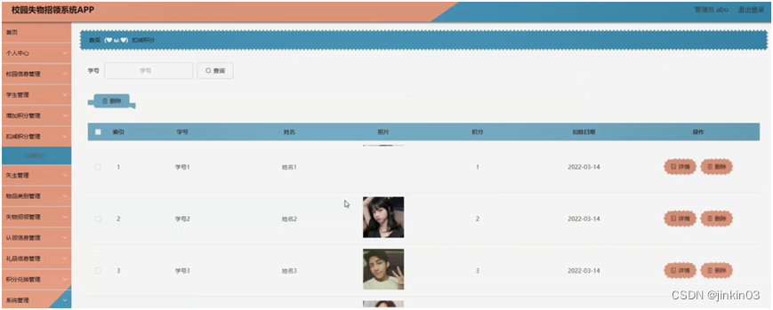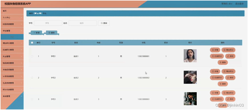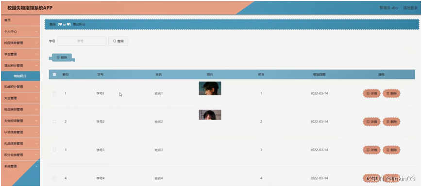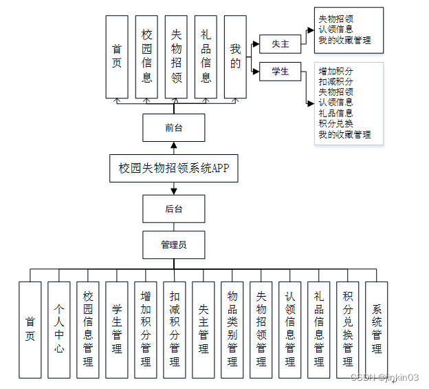 后台主要是管理员,管理员功能包括首页、个人中心、校园信息管理、学生管理、增加积分管理、扣减积分管理、失主管理、物品类别管理、失物招领管理、认领信息管理、礼品信息管理、积分兑换管理、系统管理等;