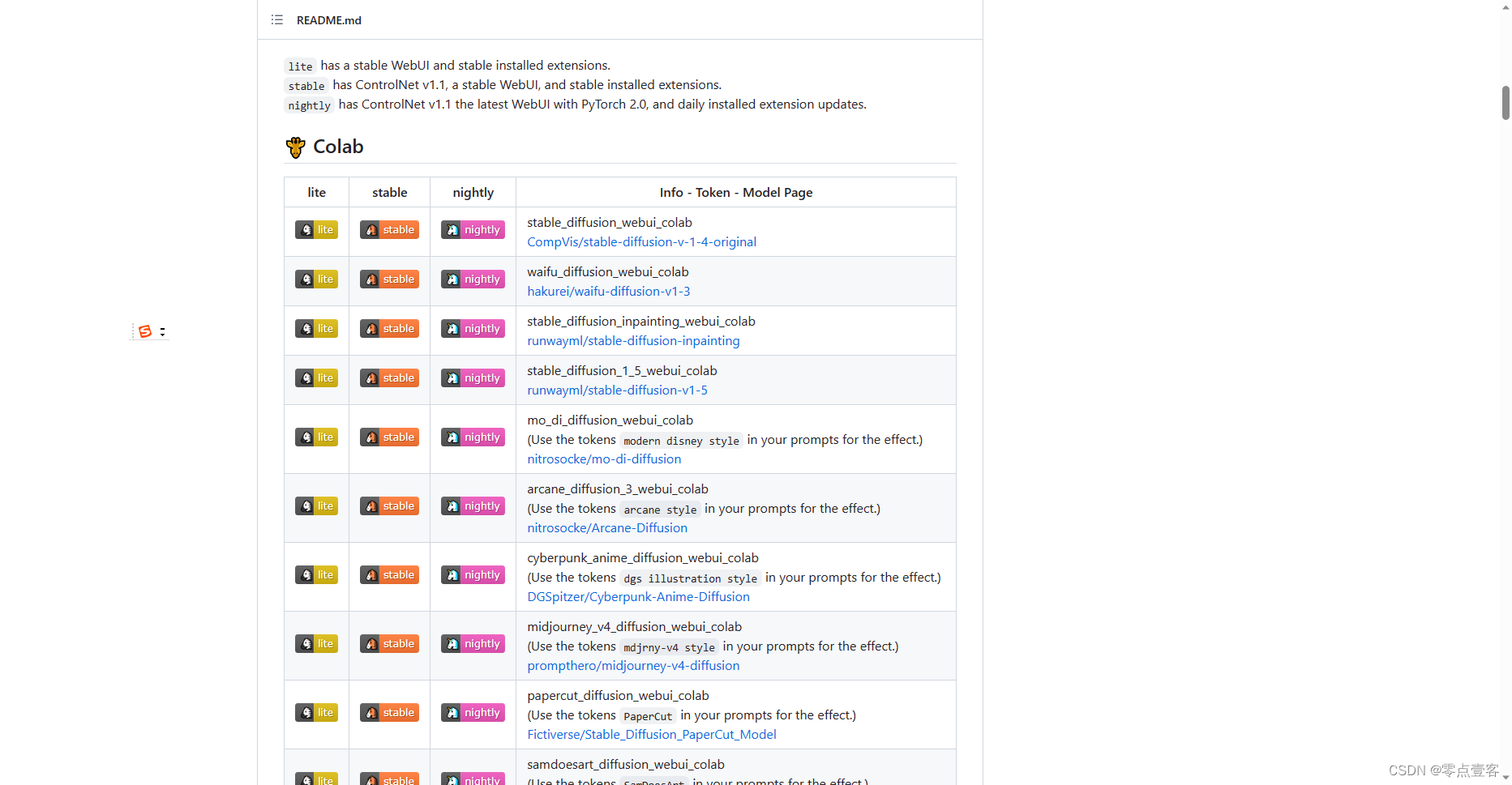 下拉readme,可以看到如下表格,lite、stable、nightly三个版本的区别在上面有介绍,这里选择第一行stable版本的,点击后跳转进入colab