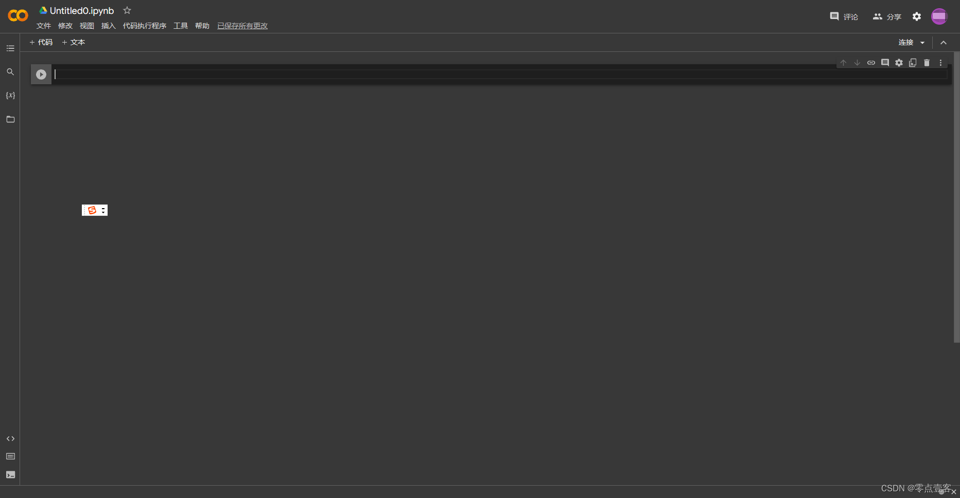 可以看到如下代码,只有一个代码块,colab运行代码之前要先登录Google 账号,没有号用手机注册一个