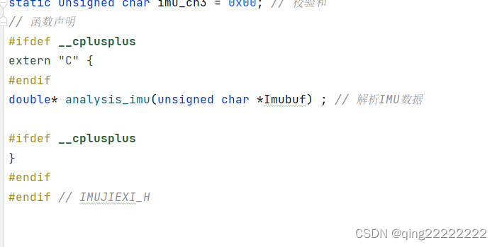 在.c文件对应的头文件中函数 analysis_imu(char_array) 没有用 extern "C"包裹,导致编译器不能识别出该c函数