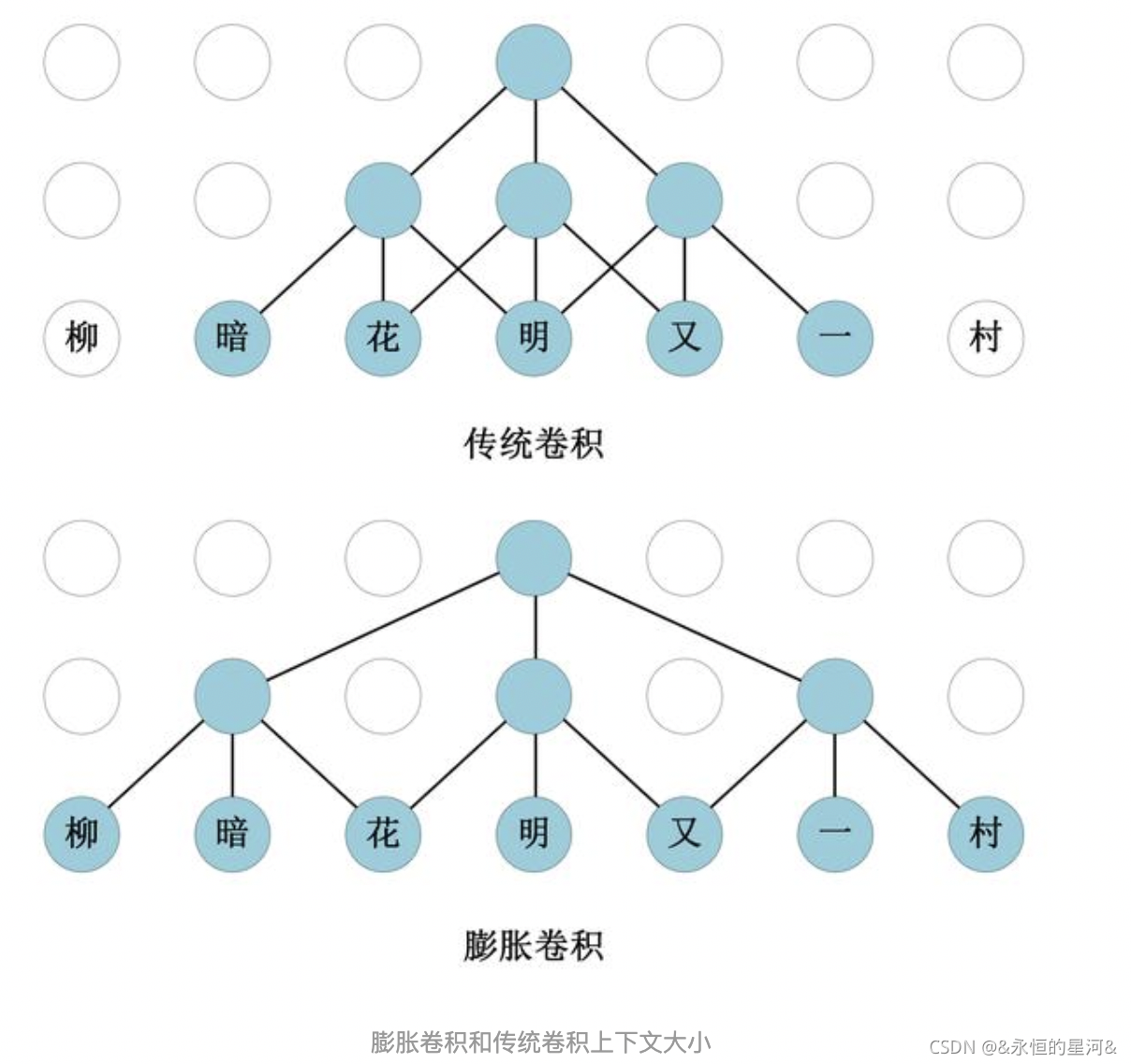膨胀卷积通过在卷积核中增加空洞,可以扩大模型的感受野 (即句子中的上下文),从下图可以看到,同样是尺寸为 3 的卷积核,同样是两层卷积层,膨胀卷积的上下文大小为 7,而传统卷积上下文大小为 5。