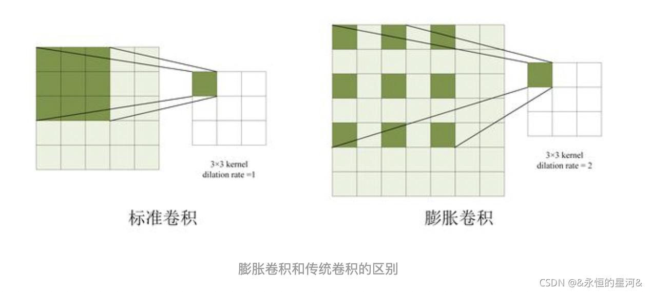 膨胀卷积 (Dilated Convolution) 是指卷积核中存在空洞,下图展示了膨胀卷积和传统卷积的区别。