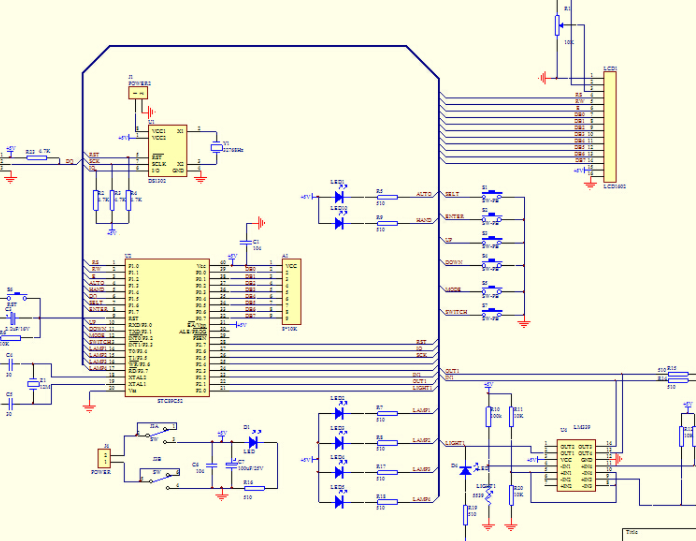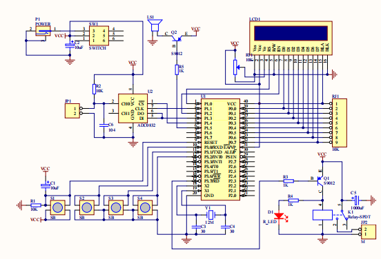 【1105】设计思路:主要包含LCD显示电路、电流采集电路、电压采集电路、电量采集电路、LED指示电路、温度传感器、蜂鸣器电路、电源电路、继电器电路、单片机系统电路。
