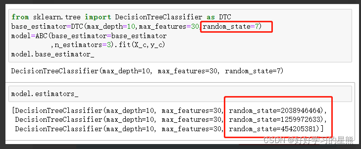 - 建模完成后,可以使用base_estimator_来查看当前弱评估器;可以使用estimators_查看当前集成模型中所有弱评估器的情况