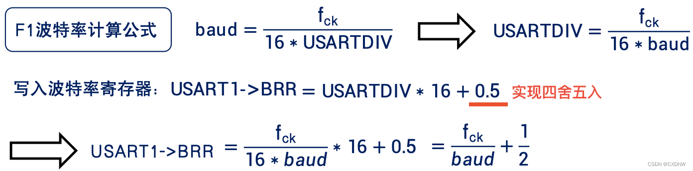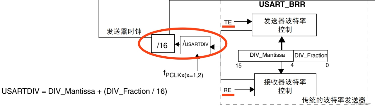【 ①fck是串口的时钟。(只有USART1 使用PCLK2(APB2最高72MHz)。其它USART使用PCLK1(APB1最高36MHz) ②USARTDIV是一个无符号的定点数 】