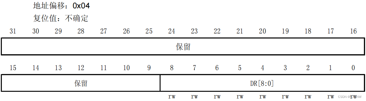 DR[8:0]为串口数据,包含了发送或接收的数据。它由两个寄存器组成的,一个给发送用(TDR),一个给接收用(RDR),且兼具读和写的功能。TDR 寄存器提供了内部总线和输出移位寄存器之间的并行接口。RDR 奇存器提供了输入移位寄存器和内部总线之间的并行接口。