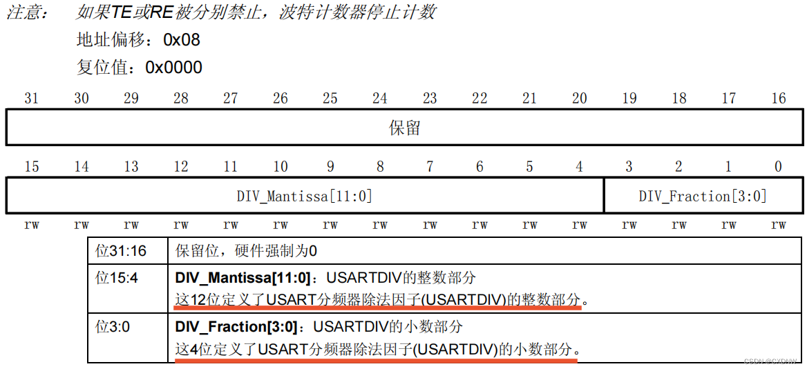 把USARTDIV的整数部分写入位[15:4], USARTDIV的小数部分写入[3:0]。