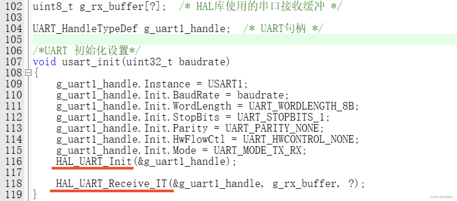 (3)开启串口异步接收中断:HAL_UART_Receive_IT() (以中断的方式接收指定字节的数据)