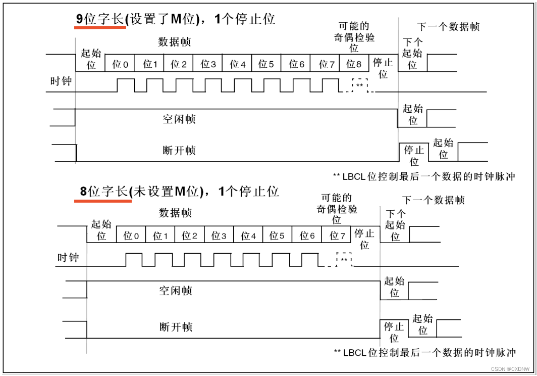 (1)字长:可以通过编程USART_CR1寄存器选择成8或9位。在起始位期间,TX脚处于低电平,在停止位期间处于高电平。