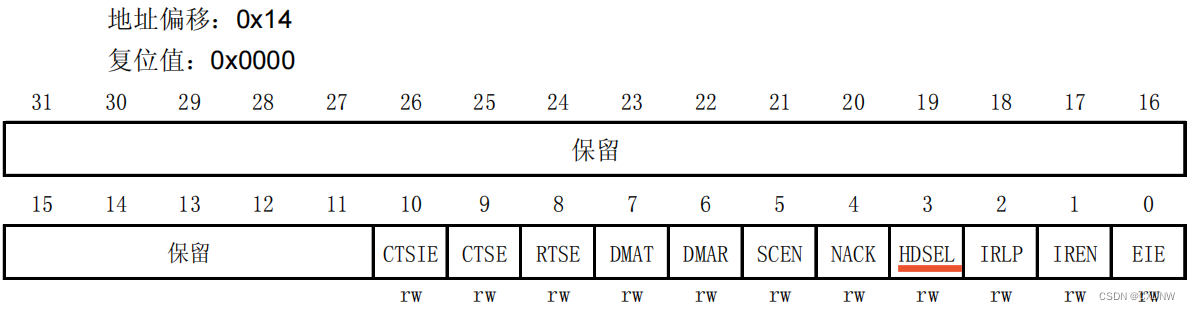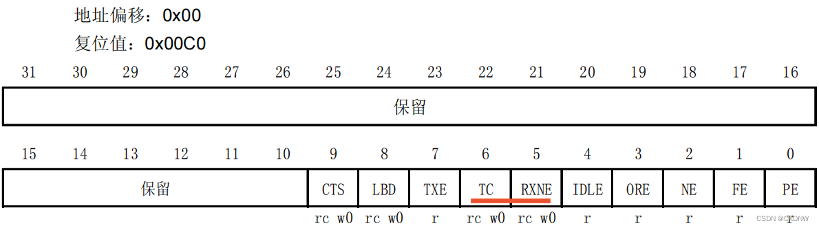 位5(RXNE):当该位被置1的时候,就是提示已经有数据被接收到了,并且可以读出来了。这时候我们要做的就是尽快去读取 USART_DR,通过读 USART_DR 可以将该位清零,也可以向该位写0,直接清除。