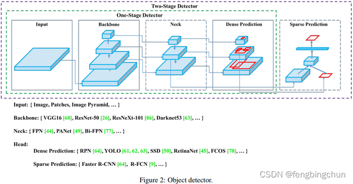 (1).Object detection models:现代检测器通常由两部分组成:在ImageNet上预先训练的主干网络(Backbone)和用于预测目标的类别和边界框的头部(Head)。对于那些在GPU平台上运行的检测器,它们的主干网络可以是VGG、ResNet、ResNeXt或DenseNet。对于那些运行在CPU平台上的检测器,它们的主干网络可以是SqueezeNet、MobileNet或ShuffleNet。对于头部,通常分为两种,即单阶段目标检测器和两阶段目标检测器(one-stage object detector and two-stage object detector)。最具代表性的两阶段目标检测器是R-CNN系列,包括fast R-CNN、faster R-CNN、R-FCN和Libra R-CNN。还可以使两阶段目标检测器成为无锚(anchor-free)目标检测器,例如RepPoints。对于单阶段目标检测器,最有代表性的模型是YOLO、SSD和RetinaNet。近年来,开发了无锚的单阶段检测器。这类检测器有CenterNet、CornerNet、FCOS等。近年来发展的目标检测器经常在Backbone和Head之间插入一些层,这些层通常用于收集不同阶段的特征图。我们可以将其称为目标检测器的颈部(Neck)。通常,颈部由多个自下而上(bottom-up)的路径和多个自上而下(top-down)的路径组成。配备该机制的网络包括特征金字塔网络(FPN, Feature Pyramid Network)、路径聚合网络(PAN, Path Aggregation Network)、BiFPN和NAS-FPN。除了上述模型之外,一些研究人员将重点放在直接构建新的主干网络(DetNet、DetNAS)或新的整体模型(SpineNet、HitDetector)用于目标检测。