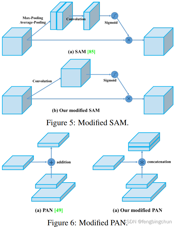 我们将SAM从空间注意力修改为点注意力(from spatial-wise attention to pointwise attention),并将PAN的快捷连接(shortcut connection)替换为串联,分别如下图所示: