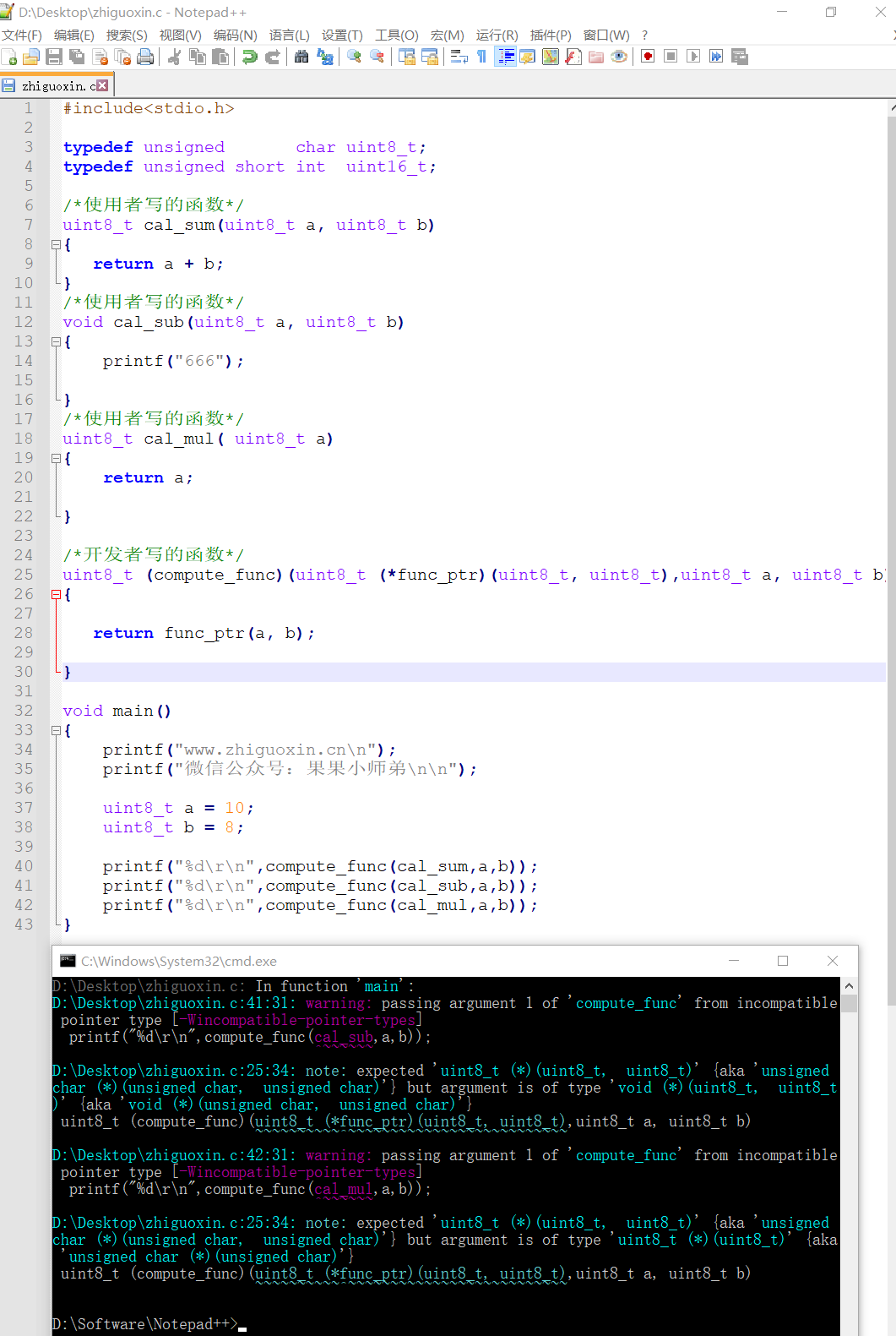 uint8_t (*func_ptr)(uint8_t, uint8_t)//函数指针有返回值