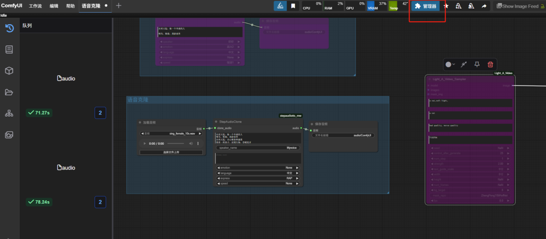 下面是原上传音频的内容。支持语气(高兴、悲伤等),多语言,加速慢速,还可将克隆的音频设置成哼唱的。发现一个好用的语音克隆工作流,大家在做数字人视频的时候可以克隆自己的声音,或者别的好听的声音。大家在搭建的过程中有遇到什么问题,或者有什么想实现的功能欢迎留言,大家一起讨论学习。若服务器受网络限制可以先在本地下载好源码,再移到服务器上面安装。2、接着可以去comfyui的manger中安装此插件。上面