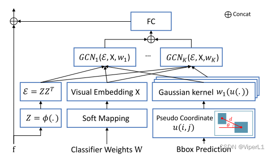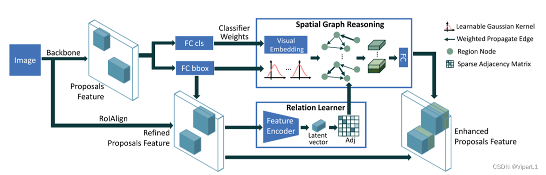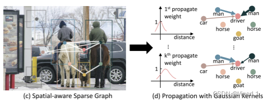 在此系统中,建议区域被定义为图节点,而不是构建类别到类别图。从而可以减少了不必要的负区域(背景)开销。接下来,由可学习的空间高斯核驱动的空间感知的图卷积被执行以传播和增强区域上下文表示。