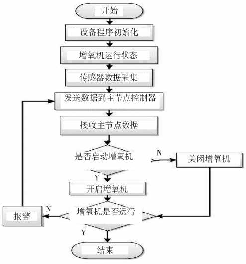 子节点控制器软件设计程序框图如图3所示。首先,程序对各个设备进行初始化设置,随后判断增氧机运行状态,同时接收溶解氧、pH、温度传感器采集的数值,并每隔30s将数据发送给主节点控制器处理,接收主节点发送过来的继电器指令并触发相应的调节机制,同时判断增氧机是否运行,倘若增氧机发生故障,程序将发送报警信息给主节点控制器。