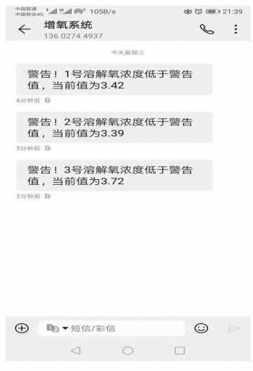 如果溶解氧含量、温度、pH超出设置范围,系统将自动报警并采取自动调节机制,同时将报警信息通过GSM短信方式发送给用户,达到实时监测和智能调节的功能,避免了因设备故障无法及时处理导致鱼浮头甚至死亡,有效降低了养殖风险。
