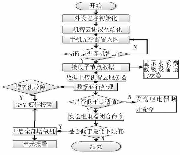 主节点控制器软件设计程序框图如图4所示。首先对处理器上各个外部设备进行初始化,然后对机智云的协议初始化并判断手机APP是否连接了机智云服务器,若连接,则接收子节点数据并现场显示,同时将数据传输到机智云服务器,然后对数据进行分析、运算、处理;判断测量值是否小于最适值,若小于,则发送继电器闭合命令,接着判断是否还低于最低下限值,若是,则启动全部增氧机并进行声光报警,同时通过GSM模块发送报警信息,实现远程报警。系统支持用户根据养殖对象的不同生长阶段动态地设置水质参数。