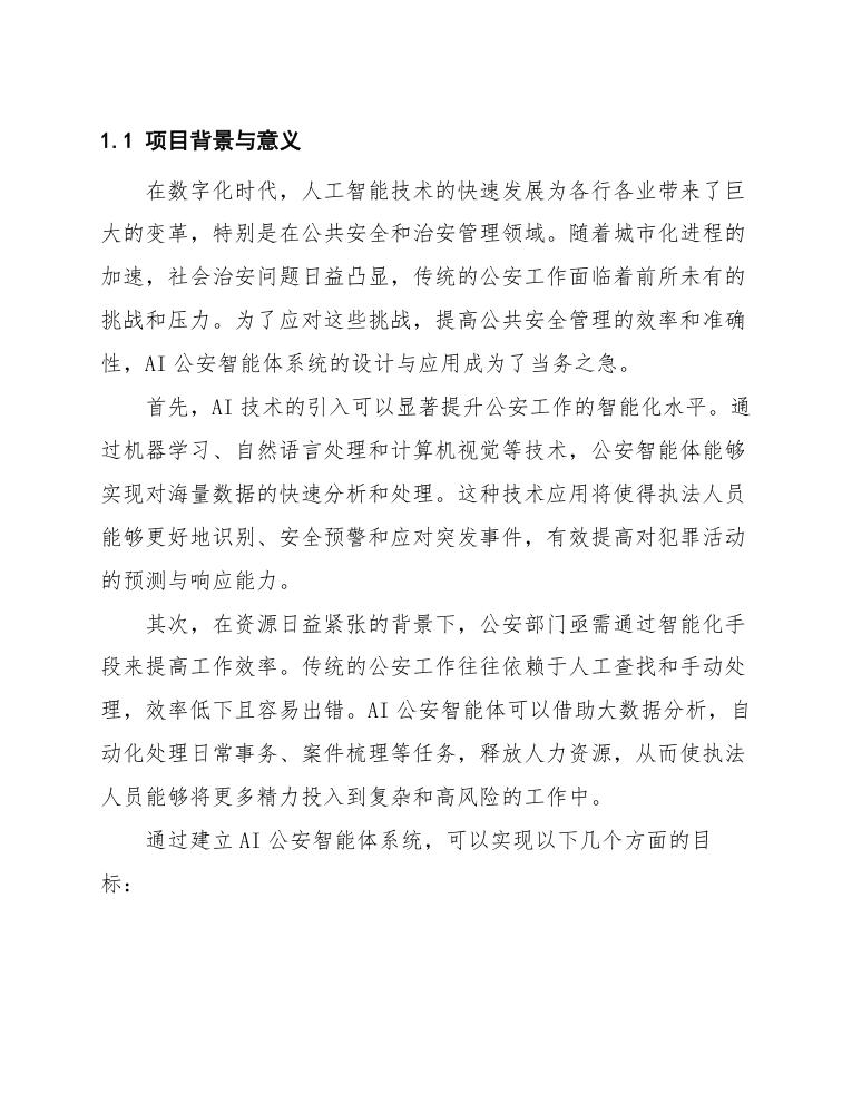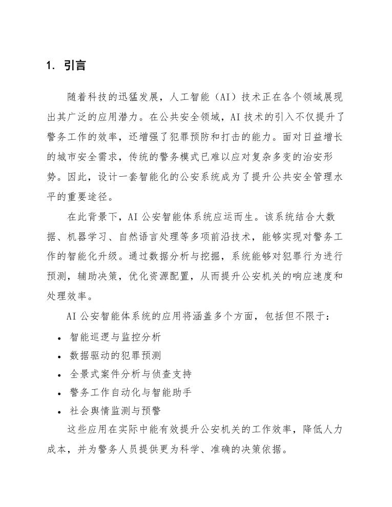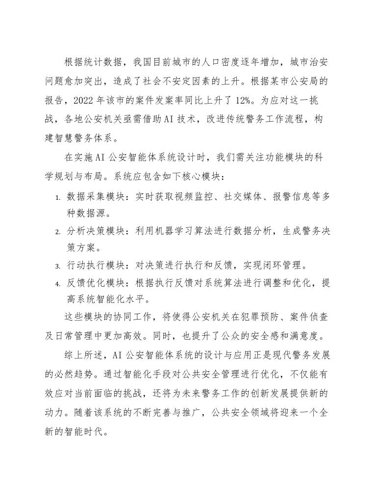 综上所述,AI公安智能体系统的设计与应用正是现代警务发展的必然趋势。通过智能化手段对公共安全管理进行优化,不仅能有效应对当前面临的挑战,还将为未来警务工作的创新发展提供新的动力。随着该系统的不断完善与推广,公共安全领域将迎来一个全新的智能时代。