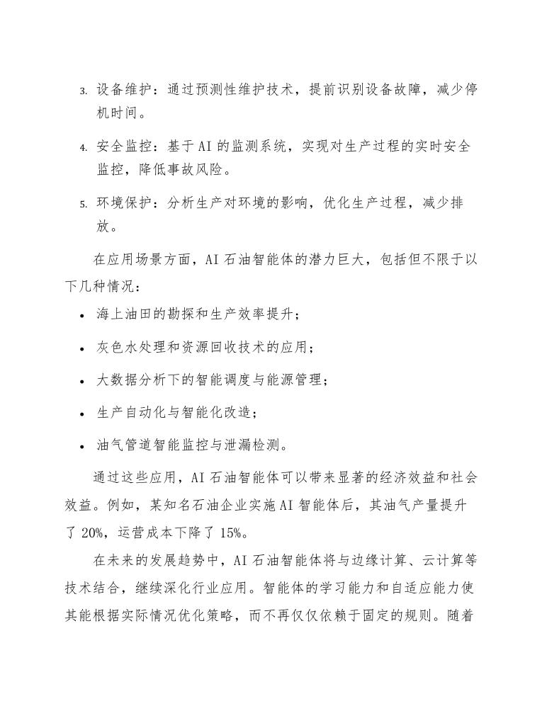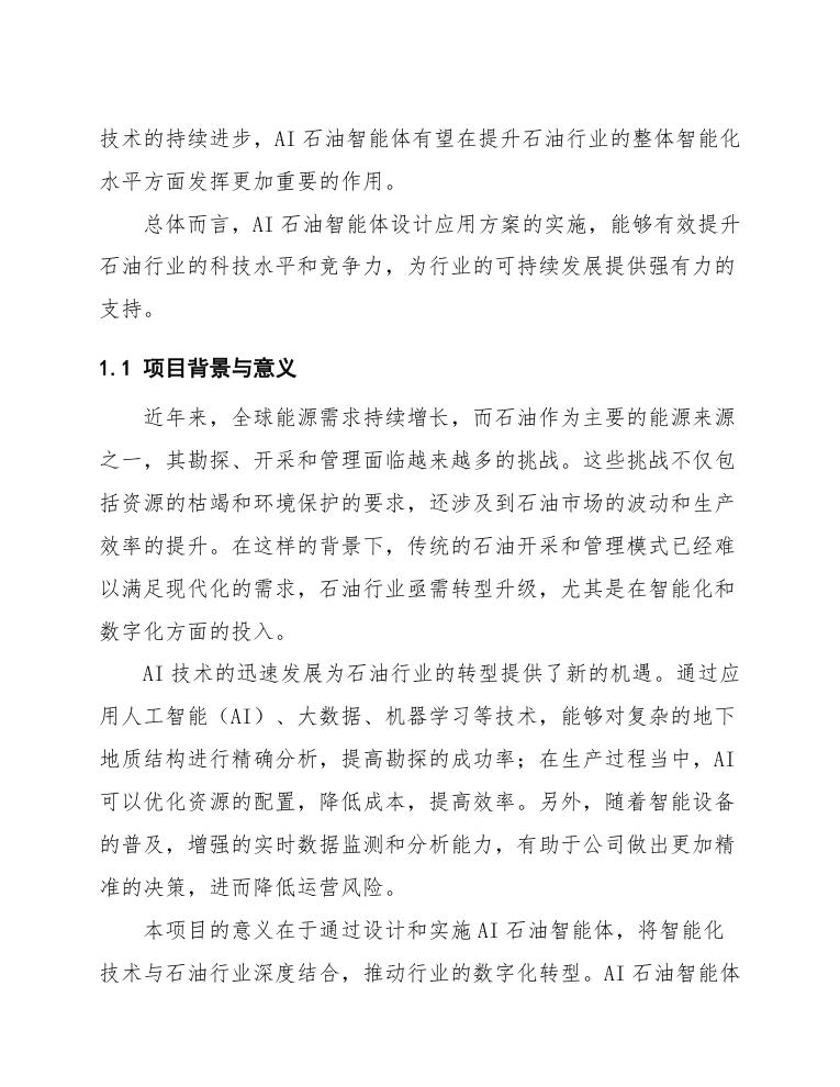 总体而言,AI石油智能体设计应用方案的实施,能够有效提升石油行业的科技水平和竞争力,为行业的可持续发展提供强有力的支持。