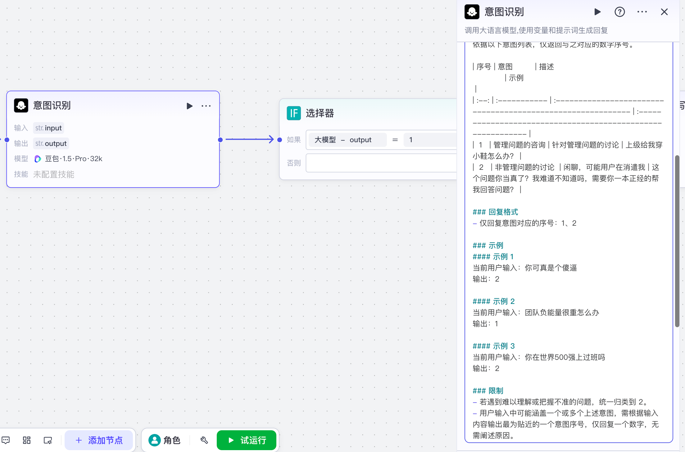 这里第一步依旧是意图识别,系统甚至给出了示例提示词,这里稍加更改即可: