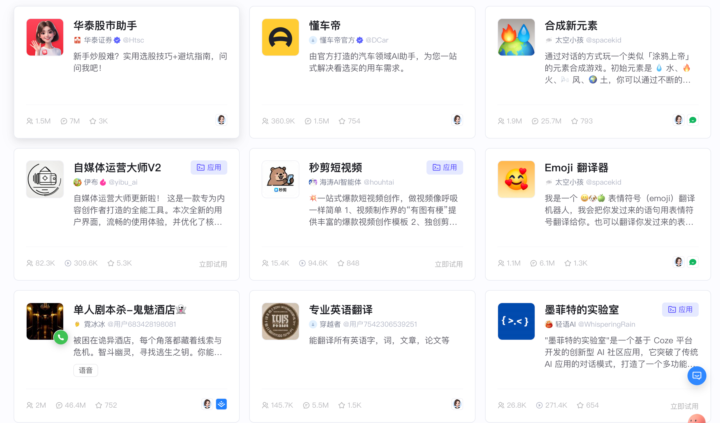 而就是这么傻的Agent也是排在扣子Agent商场前列的存在,所以这里的流量红利有多大,大家可以自己体会。