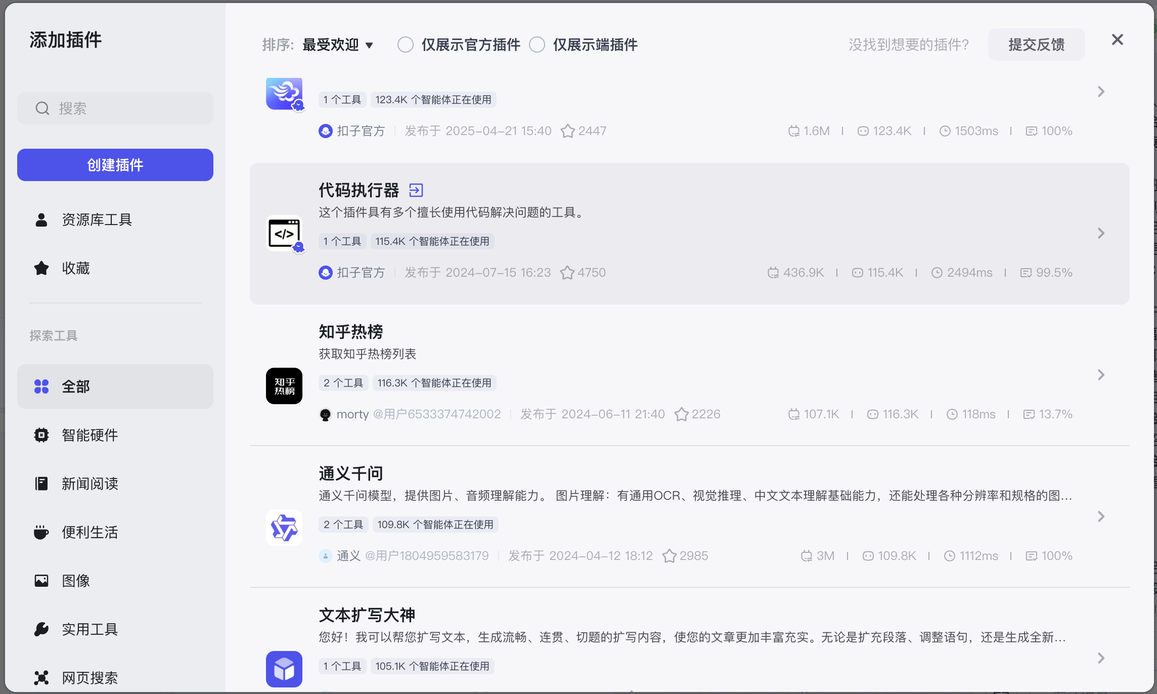第二,配套设施完备,这里的配套设施主要是其集成的知识库以及还有各个Coze开发者会上传各种MCP工具: