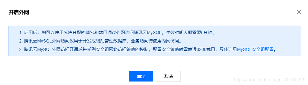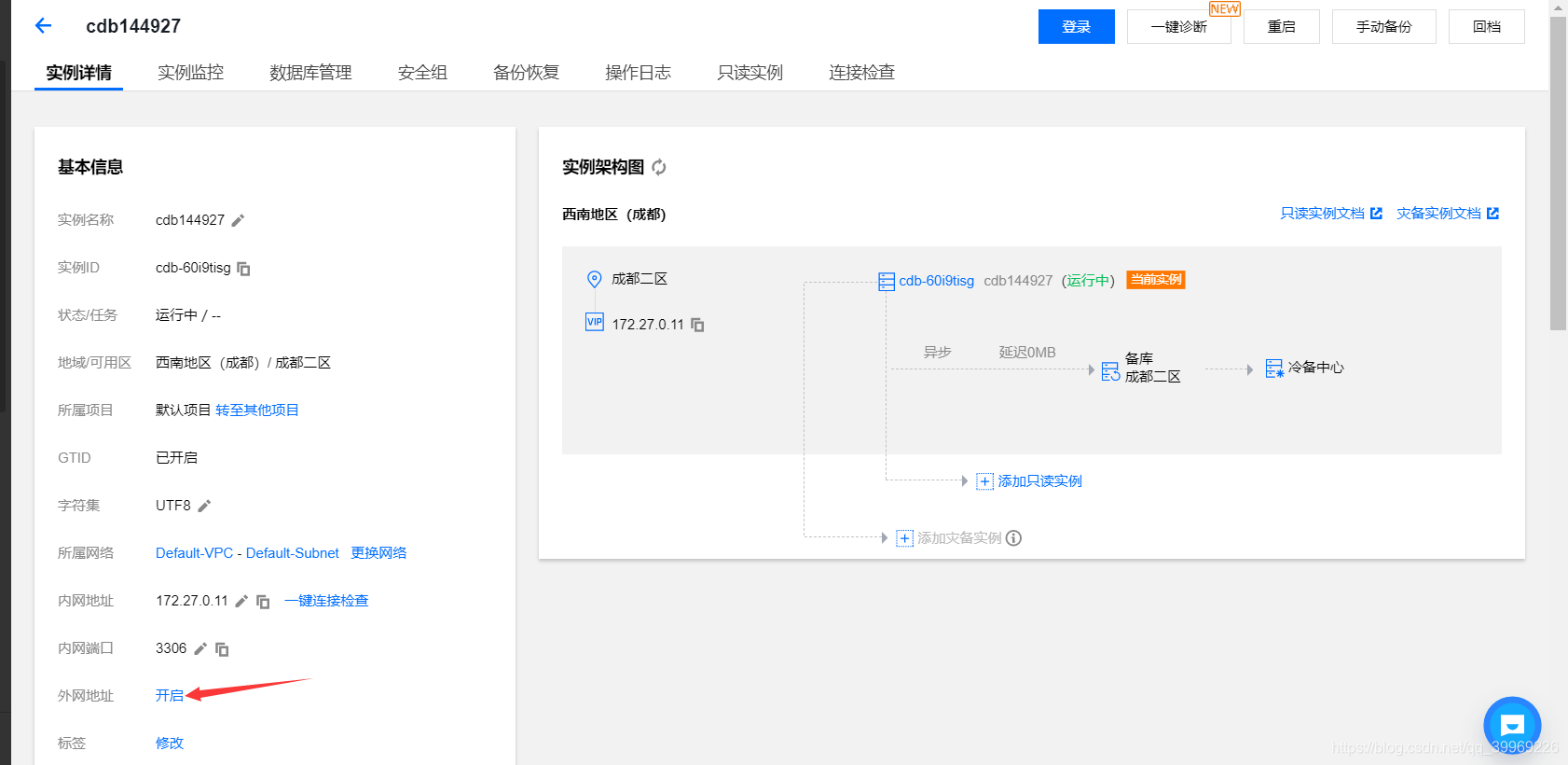 要操作云mysql需要开放出相应的公网地址,然后在本地就可以访问云mysql上的数据了。