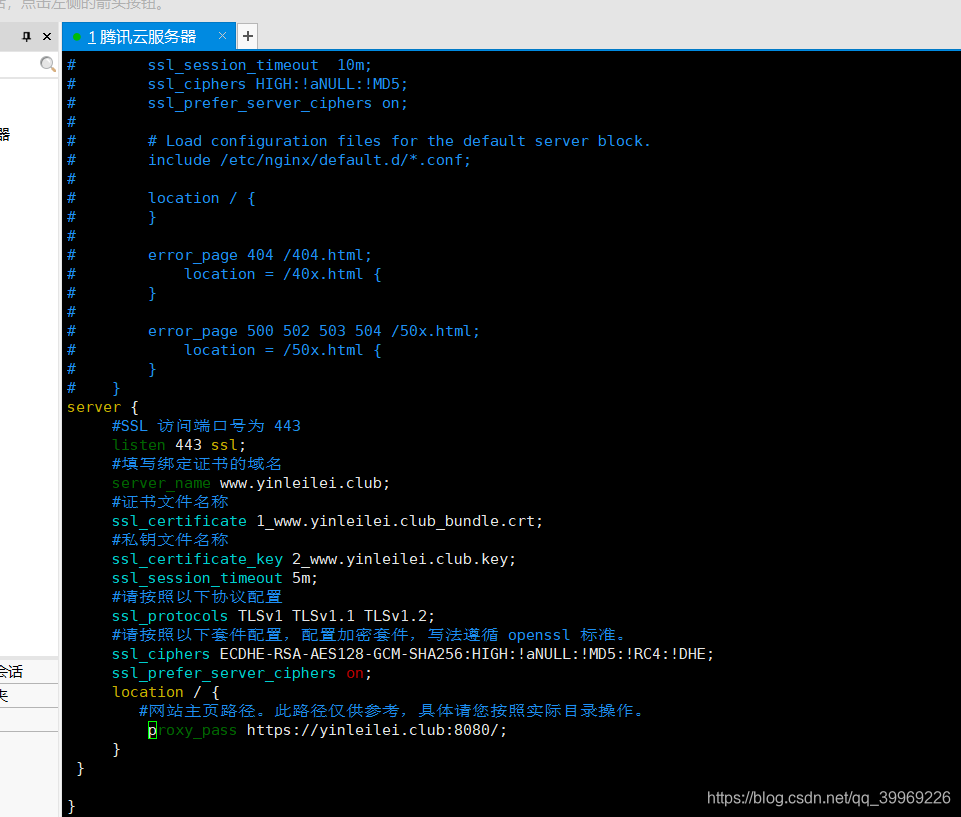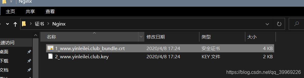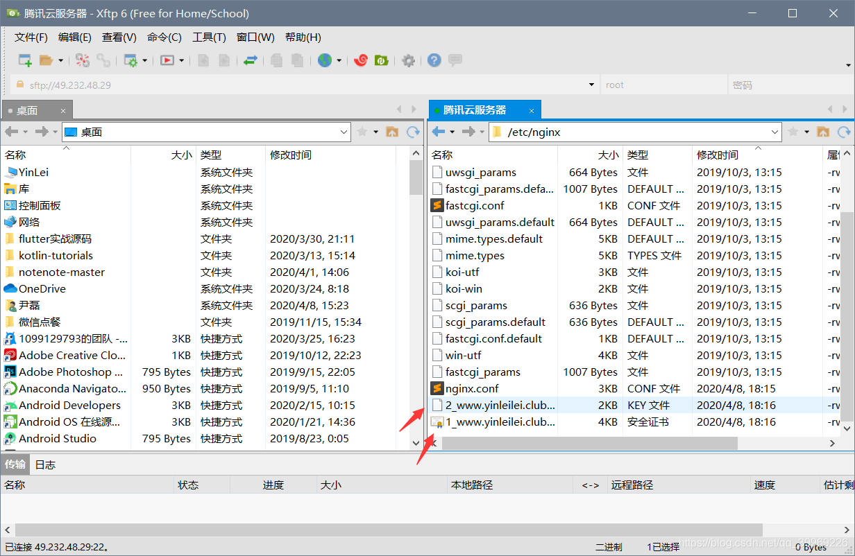 将已获取到的1_www.yinleilei.club_bundle.crt: 证书文件和 2_www.yinleilei.club.key 私钥文件从本地目录拷贝到 Nginx 服务器的 /usr/local/nginx/conf