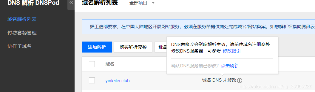 在“域名DNS未修改”上面的悬浮框上点击“刷新”: