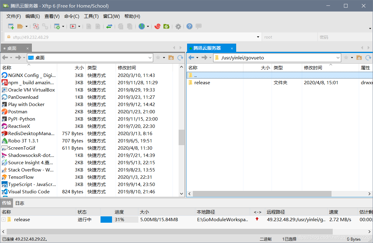 然后把打包后的release文件夹通过xftp工具上传到服务器上或者直接拖拽到xshell:
