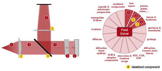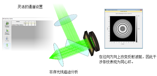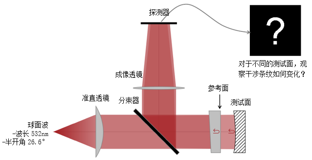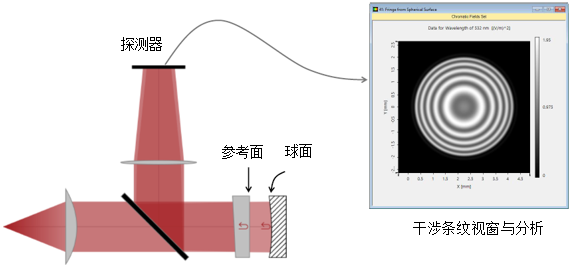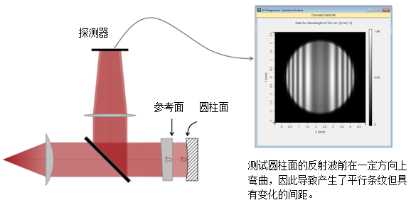 斐索干涉仪是工业中常见的光学计量设备,它们通常用于光学表面质量的高精度测试。 借助VirtualLab Fusion中的非顺序追迹,我们构建了一个菲索干涉仪,并利用它测试了不同的光学表面,例如圆柱形和球形。 可以看出,产生的干涉条纹对表面轮廓具有敏感性。