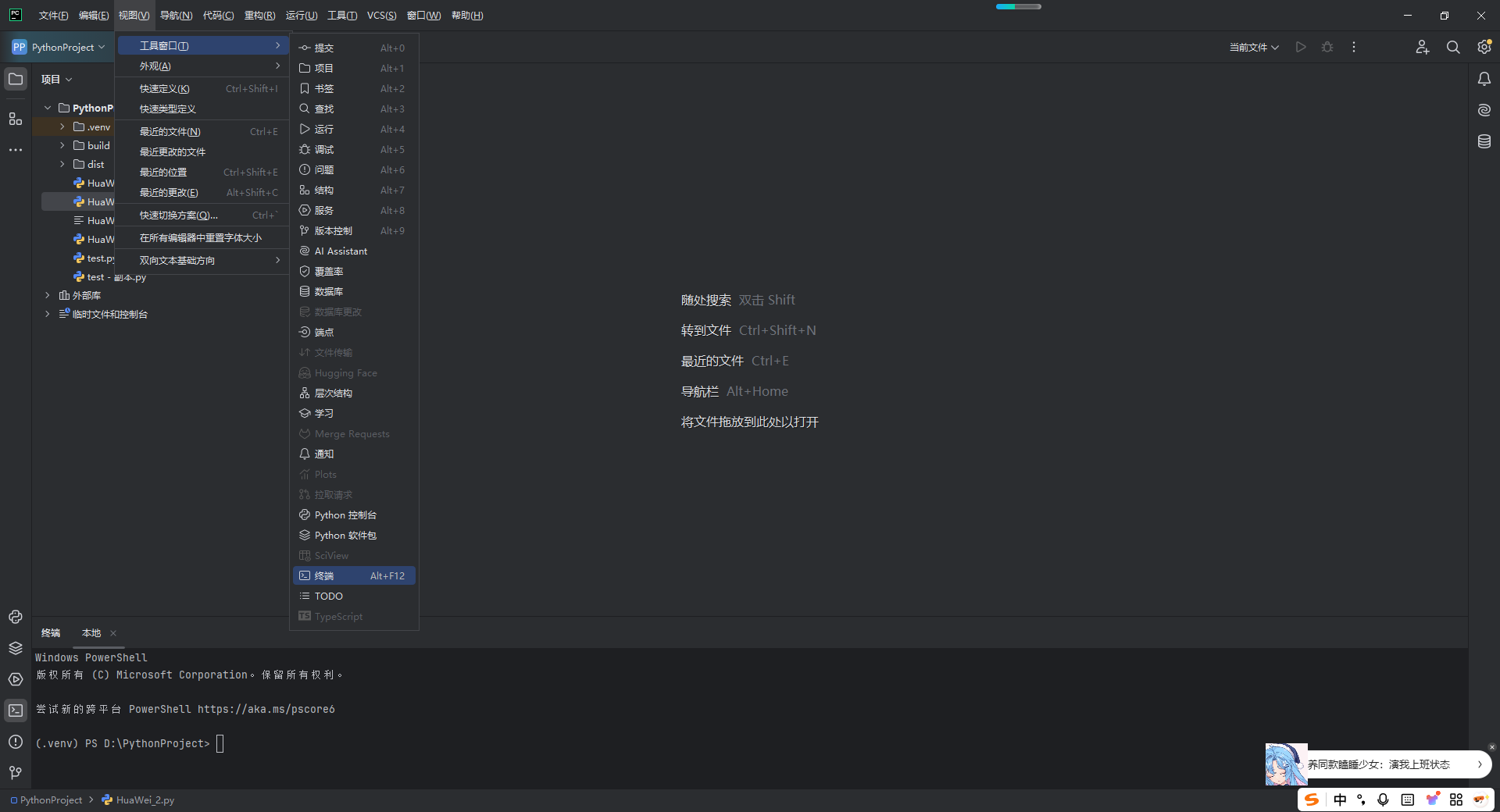 pyCharm 操作步骤类似:(视图 -> 工具窗口 -> 终端)