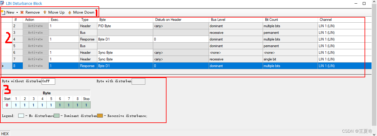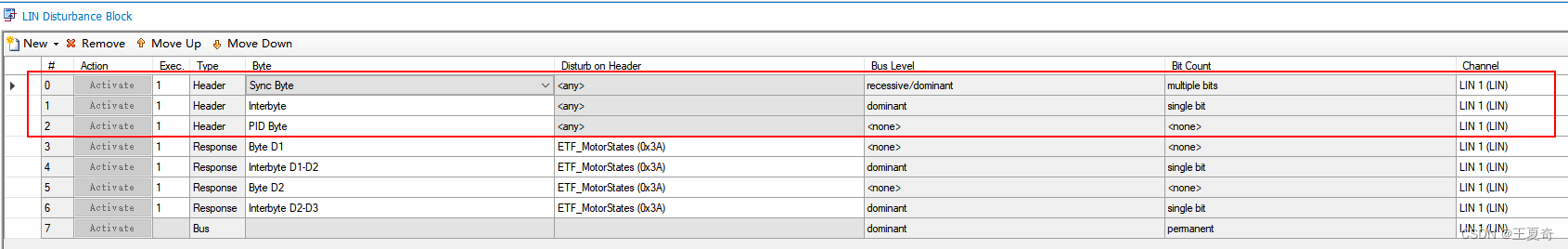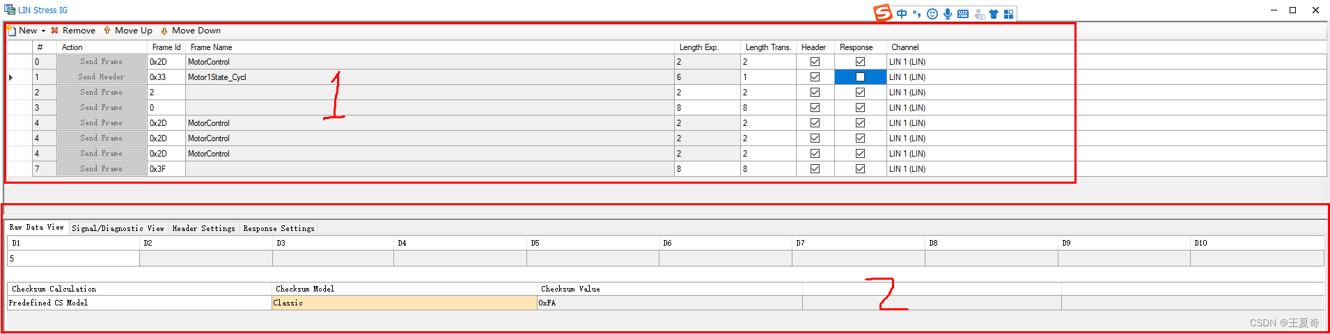 能实现功能点击工程最底下的Stress Via LINStress IG(在工程左下角,也就是文章一开头介绍的五个主要部分)IG部分主要分为两个部分,如下图New添加自定义lin帧RawFrame主任务栏添加LDF库中定义的Remove在列表移除帧先单击要去除的帧,然后单击Remove这个按钮MoveUp向上移动帧位置基本没啥用MoveDown向下移动帧位置列表设置栏(帧序号)这个不重要Actio