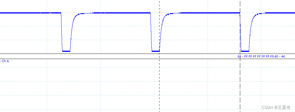 下图为19200bps,数据段全为0xFF的波形图,可以看到只有,1个起始位+8个数据全为1,在加一个bit的终止bit。故干扰一个不存在的bit肯定不会出现错误。