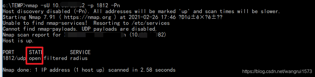 某服务使用UDP,傻傻跑去telnet 端口 来测试发现,Telnet根本不支持UDP端口,网上Windows下说用NC,但是下载下来马上被杀毒软件杀了,最后测试namp可以实现下载地址:https://nmap.org/dist/nmap-7.91-win32.zip下载解压到c:\temp运行命名,State 显示open表示正常nmap -sU 10.33.22.82 -p 1812 -Pn