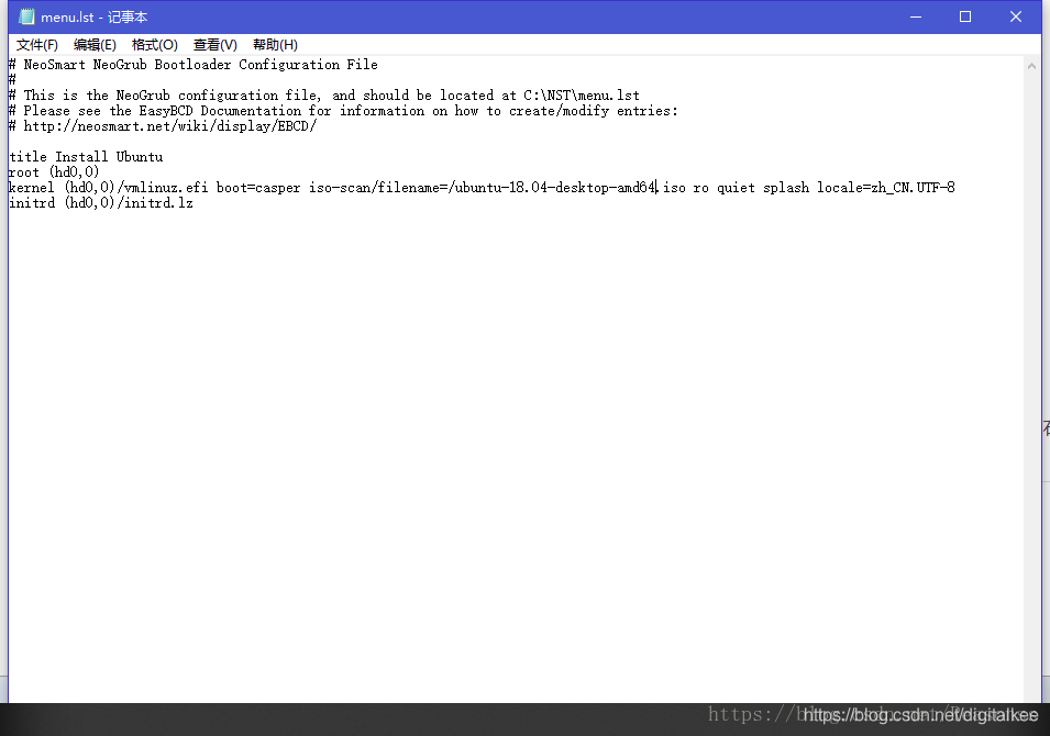 kernel (hd0,0)/vmlinuz.efi boot=casper iso-scan/filename=/ubuntu-18.04-desktop-amd64.iso ro quiet splash locale=zh_CN.UTF-8